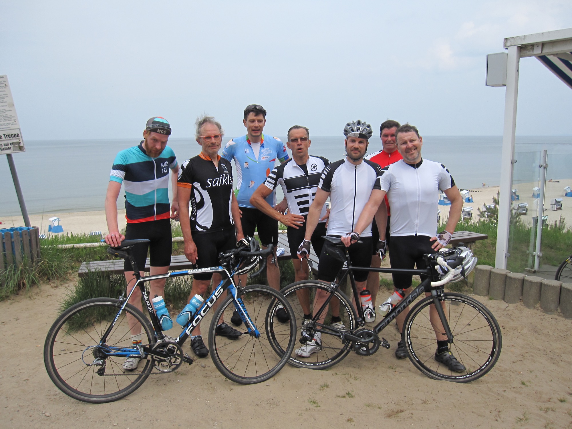 Mit ordentlich Koffein im Blut konnte es nun auf die restlichen gut 30 km gehen. Erst Radweg dann Strasse auf der Insel Usedom. Nur 5 Pkw-Fahrer die uns von der Strasse hupen wollten. Neuer Rekord. Muss am guten Wetter gelegen haben, dass uns die Blechbüchsen-Lenker halbwegs in ruhe ließen. Noch ein paar Wellen, zwei Kanten, dann einmal nach links Abbiegen, Ortsschildsprint. Ückeritz. Episches Ende einer erstklassigen Ausfahrt. Ende? Mit nichten! Jetzt begann der Spass in Form von Nacktbaden in der maximal 7°C warmen Ostsee und anschließendem Hering-Satt-Essen im beliebten Ausflugsrestaurant Utkiek Ückeritz.