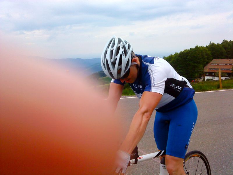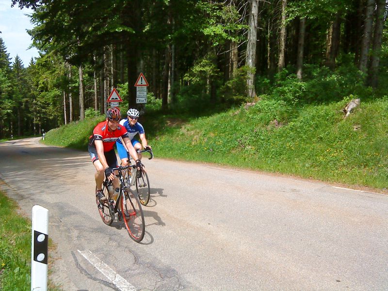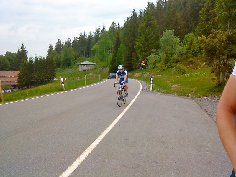 Oben angekommen gab es dann viel Sonne und Wind, aber leider kein alkoholfreies Hefeweizen. Schade, also ohne isotonischen Durstlöscher weiter zu unsere zweiten Herausforderung: Nach der schönen aber kurzen Abfahrt nach Spielweg ging es auch gleich wieder in den Berg. Diesmal aber stetig im zweistelligen Prozentbereich. Kein wirkliches Vergnügen, nach dem langen kräftezehrenden ersten Anstieg. Ich war froh, das ich meine Dreifachkurbel an Bord hatte und begann, mich mit dem Anstieg anzufreunden. Ich wusste das das Ziel Schauinsland bei 1.220 Höhenmeter liegt, konnte also auf meinem Garmin die Höhenmeter sehen, die noch zu überwinden waren. Und sie schmolzen bei der intensiven Steigung schnell dahin.