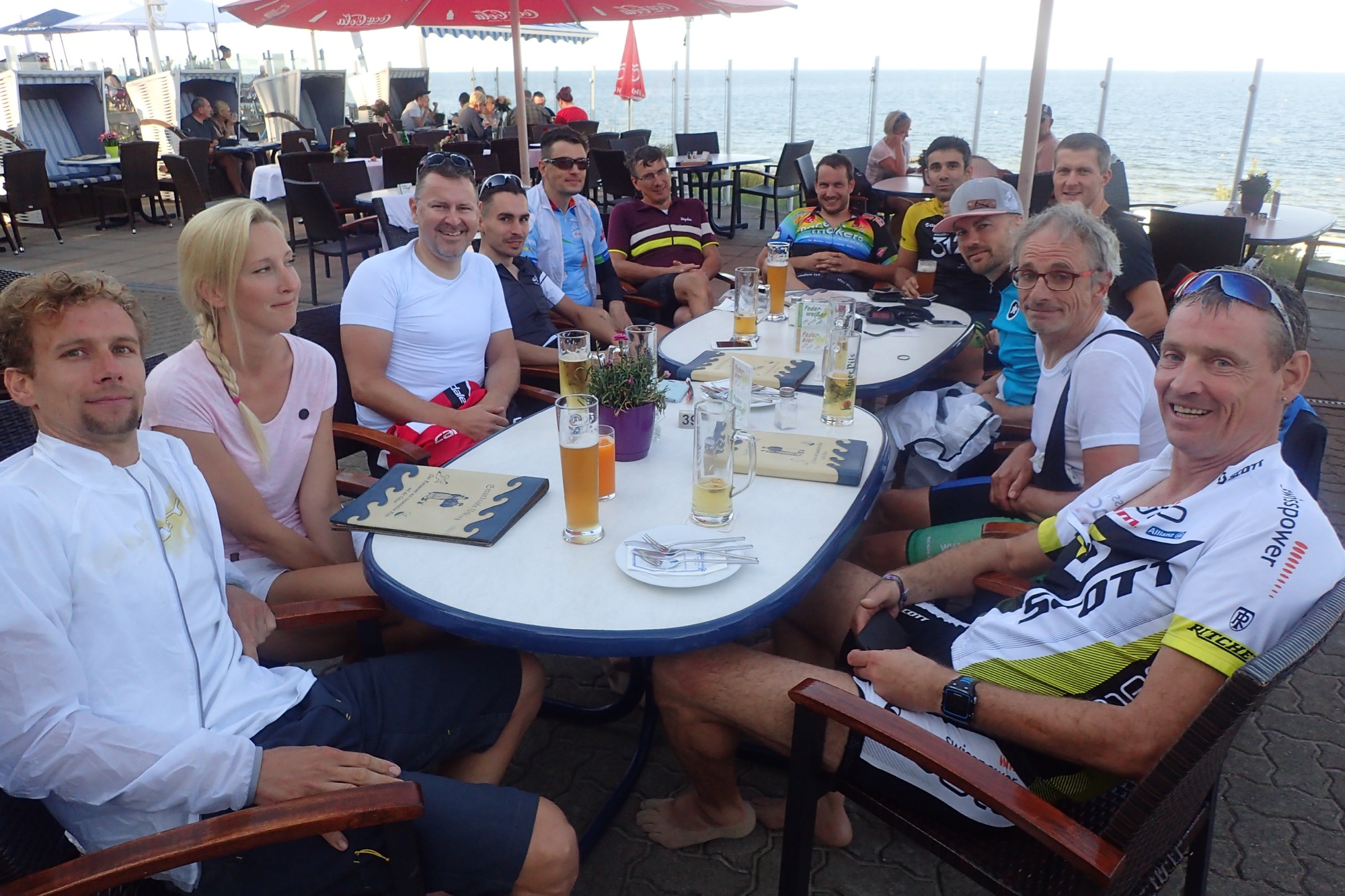 Nun noch etwa 20 km an der Kette zerren und dann war auch schon das Ortsschild Ueckeritz erreicht. Zum Meer fahren, abklatschen, Erinnerungsfoto machen und in die erfrischende Ostsee springen, waren die nächsten Schritte, bevor es leckersten Fisch mit frischem Radler-Bier gab.