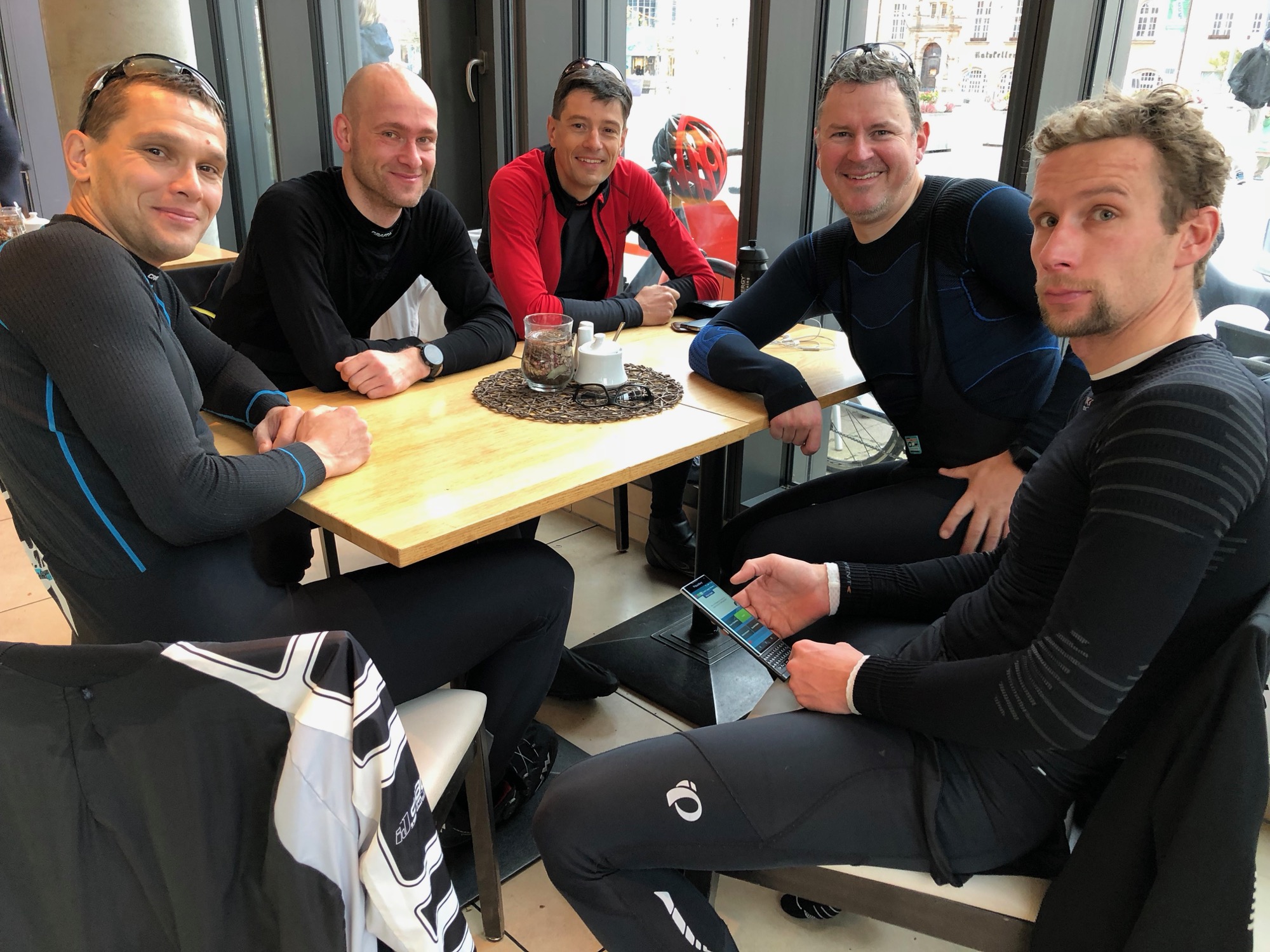 Der Hinweg nach Eberswalde gestaltet sich, bis auf einen Schleicher von Sascha, sehr komfortabel. Dies war nicht nur dem Rückenwind geschuldet, sondern auch der guten Führungsarbeit der Gruppe. Schwups, sassen wir beim Kuchen. Herrlich! Die üblichen, heute nicht zu detaillierten Kettengespräche und dieser Im-warmen-zuhause-auf-der-Stelle-in-der-Südsee-radeln-erklär-Talk wurde auch abgehalten. Still not convinced.