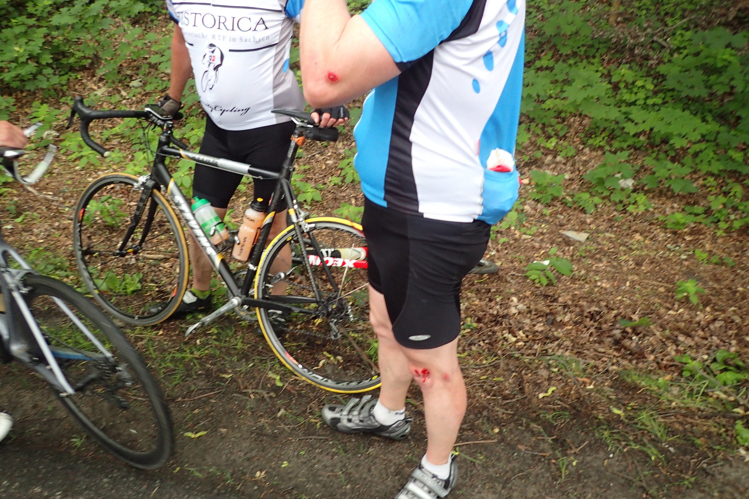 Kurz vor Kremmen an dem kleinen Hügel rumste es dann. Erik, der ganz hinten fuhr, verlor aufgrund eines blockierenden Hinterrades die Kontrolle seines Renners und stürzte. Tom resümierte, daß der Schnellspanner lose gewesen sei und so das Rad blockieren konnte. Erik nahm die Schürfwunden wie ein Mann und es konnte weiter gefahren werden. Glück im Unglück, daß nicht mehr passiert ist. Nicht auszudenken, was passiert wäre, wenn er vorne gefahren wäre.