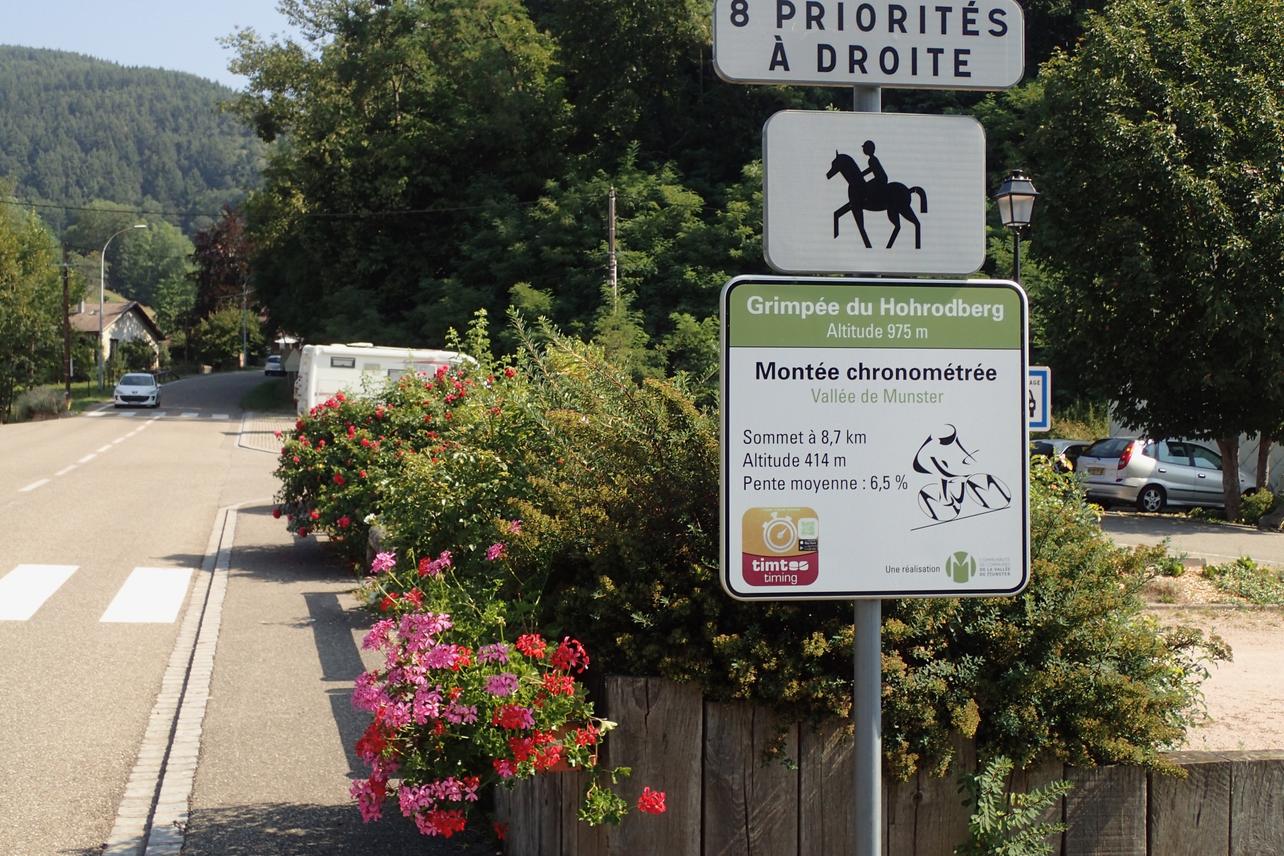 Vor mir lag ein relativ steiler Asphaltstreifen und ein Hinweisschild mit Beschreibung der kommenden knapp 10 km. Aus Angst/Respekt vesperte ich noch ein Energy-Gel, bevor es in den Anstieg Hohrodberg ging. Klasse gemachte Serpentinen wanden sich den Berg hinauf – natürlich in der Mittagshitze. Gut daß genügend zu trinken an Bord war und so erreichte ich zwar nicht in rekordverdächtiger Zeit, aber relativ lebendig das Buffet, welches an der Kreuzung zum Gipfel lag. Nun noch schnell dort hoch!