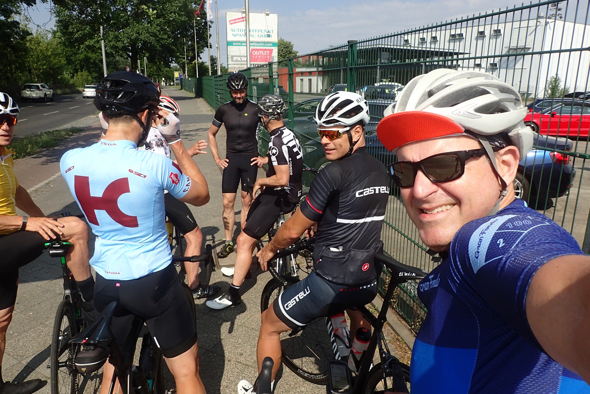 Also mit Alex eine Runde ausgerufen und schon waren wir zu siebt. Treffpunkt Metro-Spandau. Der Auto-Verkehr war bis Gatow trotz Ferienbeginns nervig aber erträglich. Keiner hupte. Hinter Sacrow gibt es dann einige Kanten, bei denen alle Protagonisten moderat fuhren. Sehr löblich, obwohl an den kleinen Anstiegen ja immer Sport-frei gilt. Oh well, Hauptsache alle haben Spass!