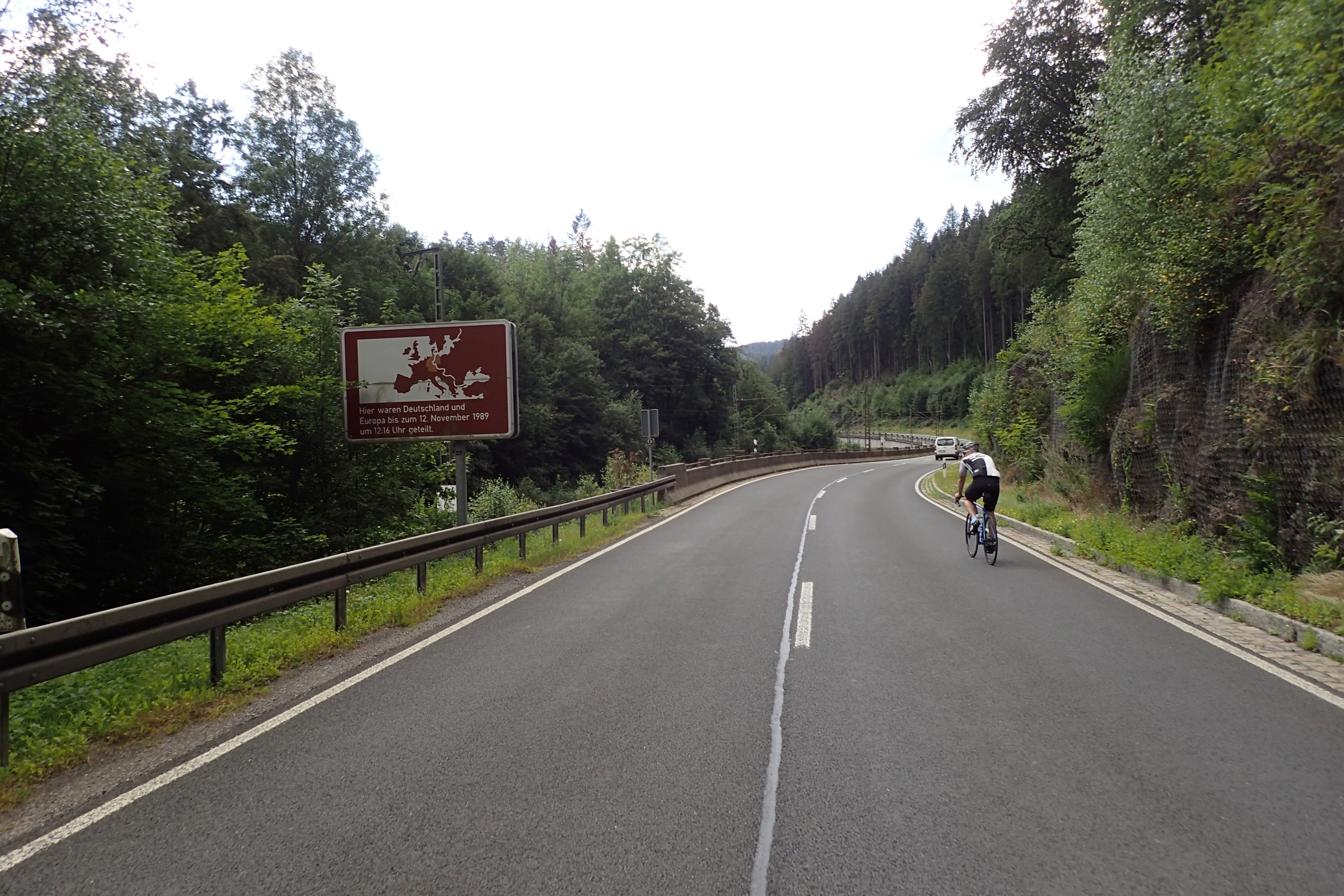 Allerdings vermochte die Streckenplanung heute nichts gutes, denn es ging erstmal gut 10 km bergauf. Genau das Richtige zum warm werden und die eigene Mitte finden. Nach etwa einer Dreiviertelstunde war sie dann oben gefunden und es konnte mit klarem Kopf und Blick auf die weiteren Höhenmeter gehen. Die Strecke war heute so geplant, daß auf dem ersten Drittel die Hälfte der Höhenmeter versteckt waren. Das knallte ganz schön in den Beinen und wir waren heilfroh als wir nach nichtmal 50 Kilometern die Buffet-Berg-Ankunft im bayrischen fränkischen Lauenstein erreichten. Da gabs nicht nur was zum Futtern auf die Kralle sondern auch was auf die Augen zum angucken. Und zwar eine sehr schöne Burg, welche aber erstmal mit einer steilen Anfahrt von uns erobert werden musste. Nach erstklassiger Stärkung am Buffet ging es weiter mit Track und Höhenmetern. Irgendwie ganz schön zermürbend diese 13%-Passagen im dichten Wald.