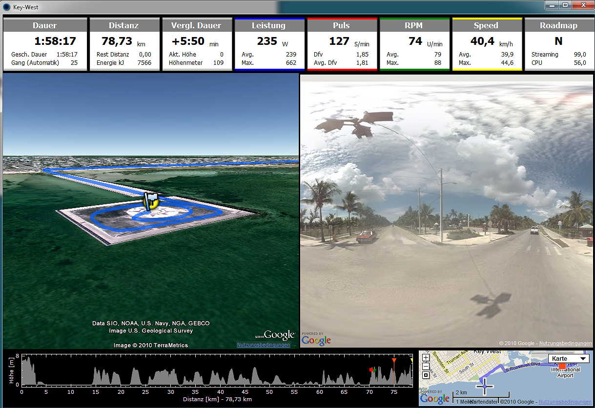Nach den doch recht anstrengenden Einheiten von Gestern, wollte ich heute Grundlagenausdauer trainieren. Dafür ist die ErgoPlanet Strecke »Key-West« hervorragend geeignet, denn sie hat sehr wenig Höhenmeter zu bewältigen und ist deshalb sehr gleichmäßig fahrbar.