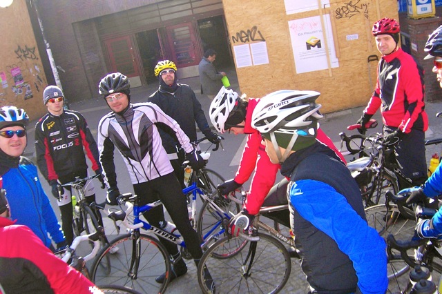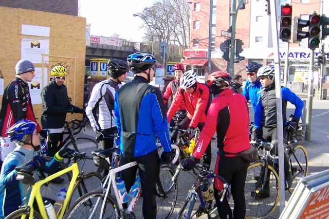Als ich um 10 vor 10 aus der relativ warmen U-Bahn am Treffpunkt ankam, war noch niemand dort. Schnell kamen aber aus allen Himmelsrichtungen Rennradler, darunter auch viele bekannte Gesichter, echte Kettenbrüder, die ich in diesem Jahr noch nicht gesehen hatte. Die Freude war groß und das neue Material wurde beäugt, bevor Ralf um 5 nach 10 eintraf und wir uns dann auf den Weg Richtung Neuköllner-Krone machten.