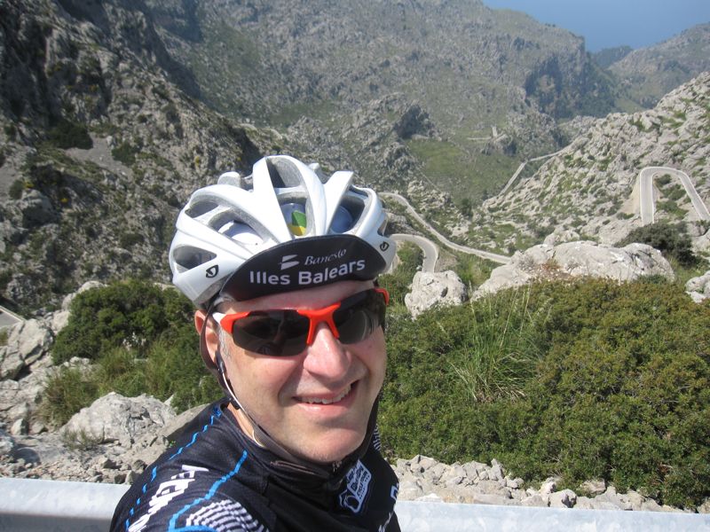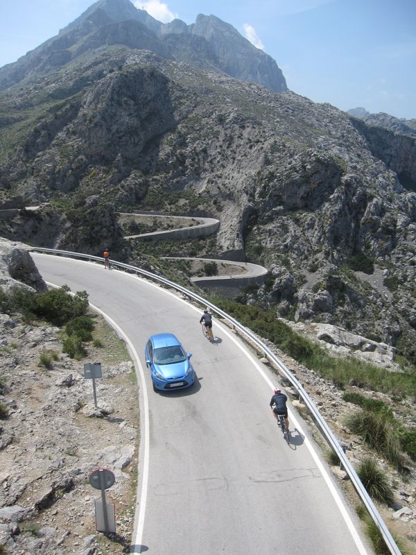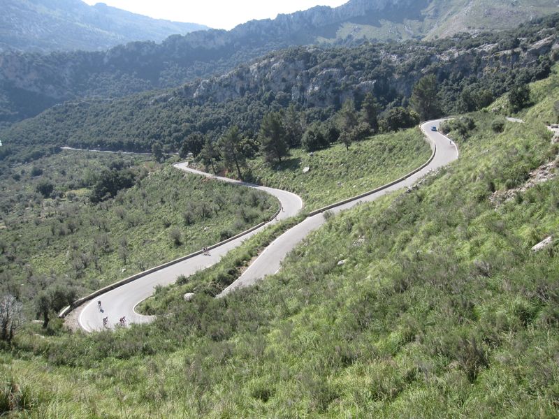 Beim Einstieg hoch nach Lluc legte Alexander gleich ordentlich vor, das sogar Herbert Schwierigkeiten hatte zu folgen. Weiter ging es zum Kiosk, der Weggabelung nach Sa Calobra. Um in diesen Küstenort zu gelangen muss man erst einen 2 km langen Pass hinauf fahre, bevor es für mehr als 10 km steil bergab über viele Serpentinen auf Meereshöhe geht. Der Asphalt ist klasse und so sind dort herunter neben Rennradlern auch große Reisebusse und Motorräder unterwegs, die gerne mal umstürzen und nicht geborgen werden.