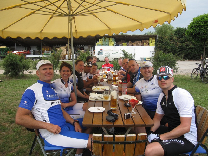 Wir fuhren weiter, nun zurück nach Osten in Richtung Wustermark und dem von dort aus 2 km entfernt gelegenen Spargelland-Hoppenrade. Einige Bergwertungen Eisenbahnbrücken mussten noch entschieden werden bevor wir endlich alle gemeinsam den von Ingo im Freien reservierten großen Tisch besetzen konnten. Die Reservierung war von Vorteil, da auf dem Hof heute Spargel-Fest mit Live-Entertainer und Hüpfburg war und alle Sitz-Plätze restlos besetzt waren. Feiner Zug! Denn einige wissen zu welchen Auswüchsen das vor zwei Jahren geführt hat.