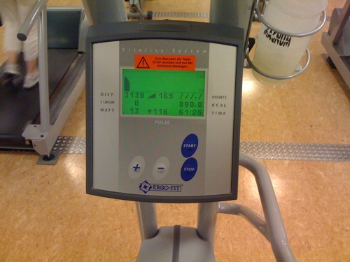 Mein Programm kenne ich ja schon in- und auswendig und so wurde wieder die Rudermaschine in Beschlag genommen, 20 Minuten powern zum warmwerden. Die prognostizierten Meter sahen nicht gut aus: War ich heute so schlecht drauf oder fehlte mir einfach der richtige Bums? Die Anzeige schwankte immer zwischen 5.050 und 5.100 Metern, was ja nun irgendwie gar nicht ging.