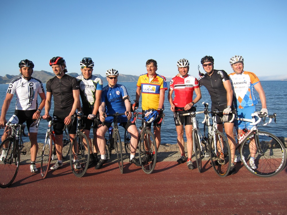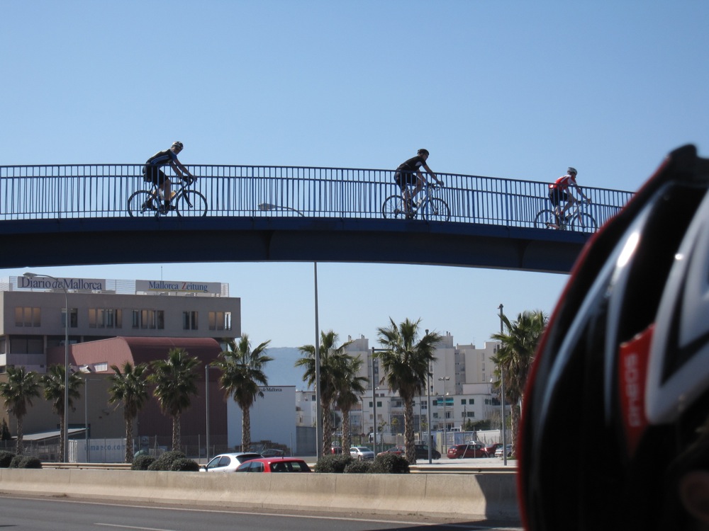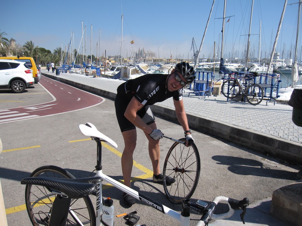 Raus ging es heute über eine relativ unbekannte Nebenstraße ins bekannte Schilf. Nach dem Passieren von Sa Pobla wurde der Muro-Radweg angesteuert und Fahrt aufgenommen. Schon nach 90 Minuten Dahingleiten passierten wir Santa Maria. Nun wurde das Terrain ein wenig steiler und wir bekamen schon mal einen schönen Vorgeschmack auf die morgige Etappe. Ein netter 7 km langer Anstieg lag vor uns, bevor es wieder auf einer flinken Abfahrt hinunter nach Palma ging. Nach einem Boxenstop bei Eroski zum Flaschen füllen wurde das Café im Jachthafen angesteuert. Café con Leche und Rüblikuchen wurden bestellt und mein Ei-Brötchen im Hafenbecken versenkt. Der Geschmack hatte sich in der Trikottasche trotz Zip-Lock leider nicht verbessert.